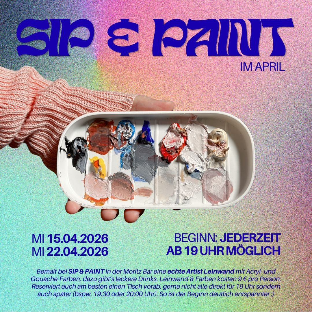 ab 19:00 UhrIn der Moritz Bar wird es wieder kreativ. Bei SIP & PAINT bekommt ihr von uns das gesamte nötige Material, um eine eigenes Bild zu bemalen - und danach könnt ihr es natürlich mit nach Hause nehmen. Dazu könnt ihr ganz gemütlich den ein oder anderen Drink schlürfen. Macht euch mal wieder einen richtig schönen und kreativen Abend, alleine oder mit euren Besties. Das Material (professionelle Artist-Leinwand, Pinsel, Acryl- und Gouachefarben) gibt es gegen einen Unkostenbeitrag von 9.00 € bei uns.