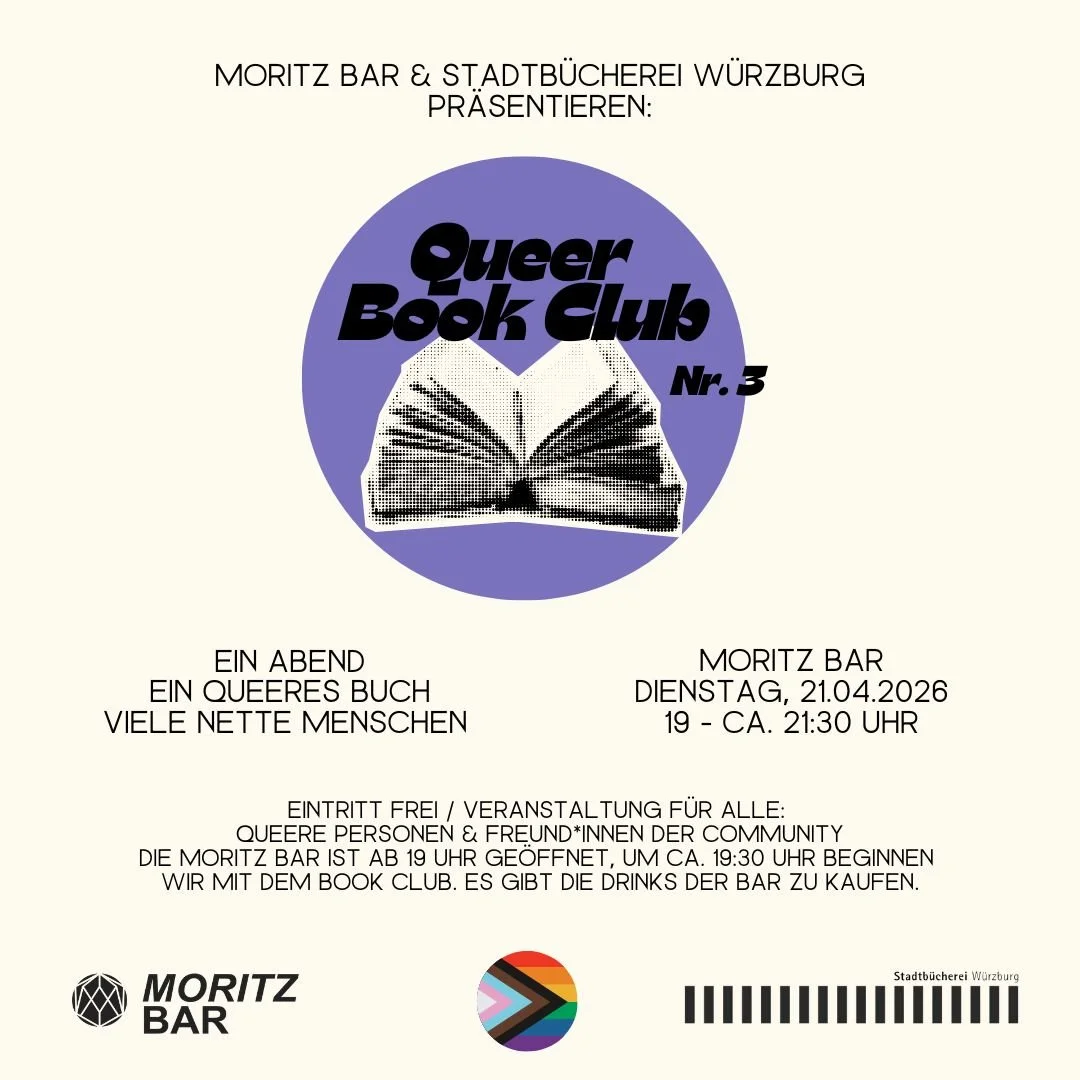 Habt ihr wieder Lust auf richtig gute neue queere Literatur? Dann kommt am 21.04.2026 zur dritten Ausgabe vom Queer Book Club, initiiert von der Moritz Bar und der Stadtbücherei Würzburg.