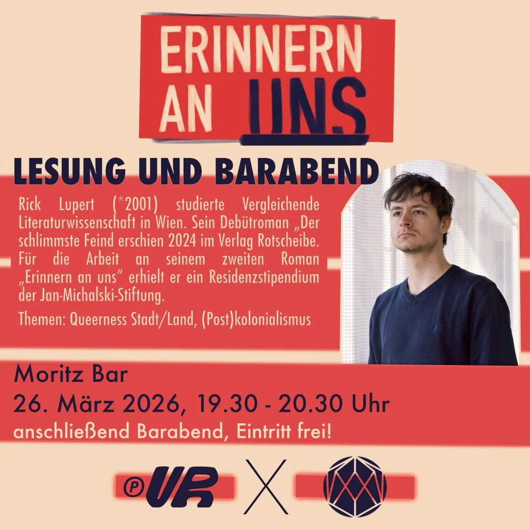 Beginn der Lesung um 19:30 UhrRick Lupert stellt in der Moritz Bar seinen neuen Roman “Erinnern an uns” vor. Wir hören ab 19:30 Uhr einige Ausschnitte des Buchs und kommen zu den Themen des Buchs miteinander ins Gespräch. Ab 20:30 Uhr klingt die Vorstellung in einen lockeren Bar-Abend aus, bei Drinks und Gesprächen.