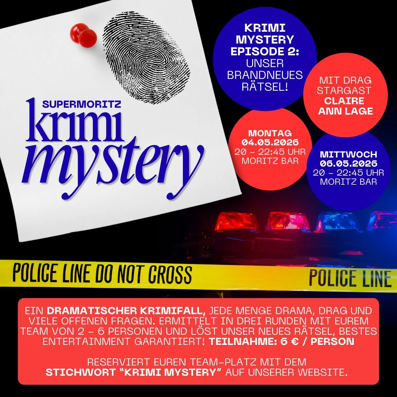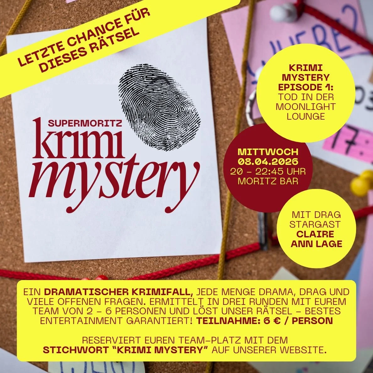 Krimi Mystery-Beginn um 20:00 UhrIhr liebt unser Quiz - und deswegen haben wir uns noch etwas Neues für euch ausgedacht. Statt durch die Welt der Popkultur laden wir euch ein, euch durch einen dramatischen Krimifall zu raten: Beim Supermoritz KRIMI MYSTERY. Ihr könnt in Teams von 2 - 6 Personen teilnehmen und euch in der Moritz Bar einen richtig unterhaltsamen Abend machen. Denn wir servieren euch einen epischen Krimifall: Mit Schauspiel-Einlagen, Hinweisen und vielen offenen Fragen. In drei Runden ratet ihr euch mit eurem Team durch das Krimi-Rätsel und am Ende erfahrt ihr, ob ihr alle Hinweise richtig kombiniert habt. Stellt euch das Ganze vor als eine Mischung aus Spieleabend, Escape-Room und Krimidinner. Für den spannenden Fall sorgen für euch Drag Stargast Claire Ann Lage und Kilian von der Moritz Bar. Und eines können wir euch versprechen: Es wird witzig, es wird spannend, es wird camp, und es wird beste Unterhaltung sein. Hinweis: Dieses Rätsel findet zum letzten Mal statt, im Mai gibt es dann ein neues Rätsel für euch.
