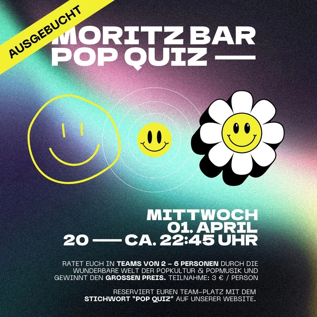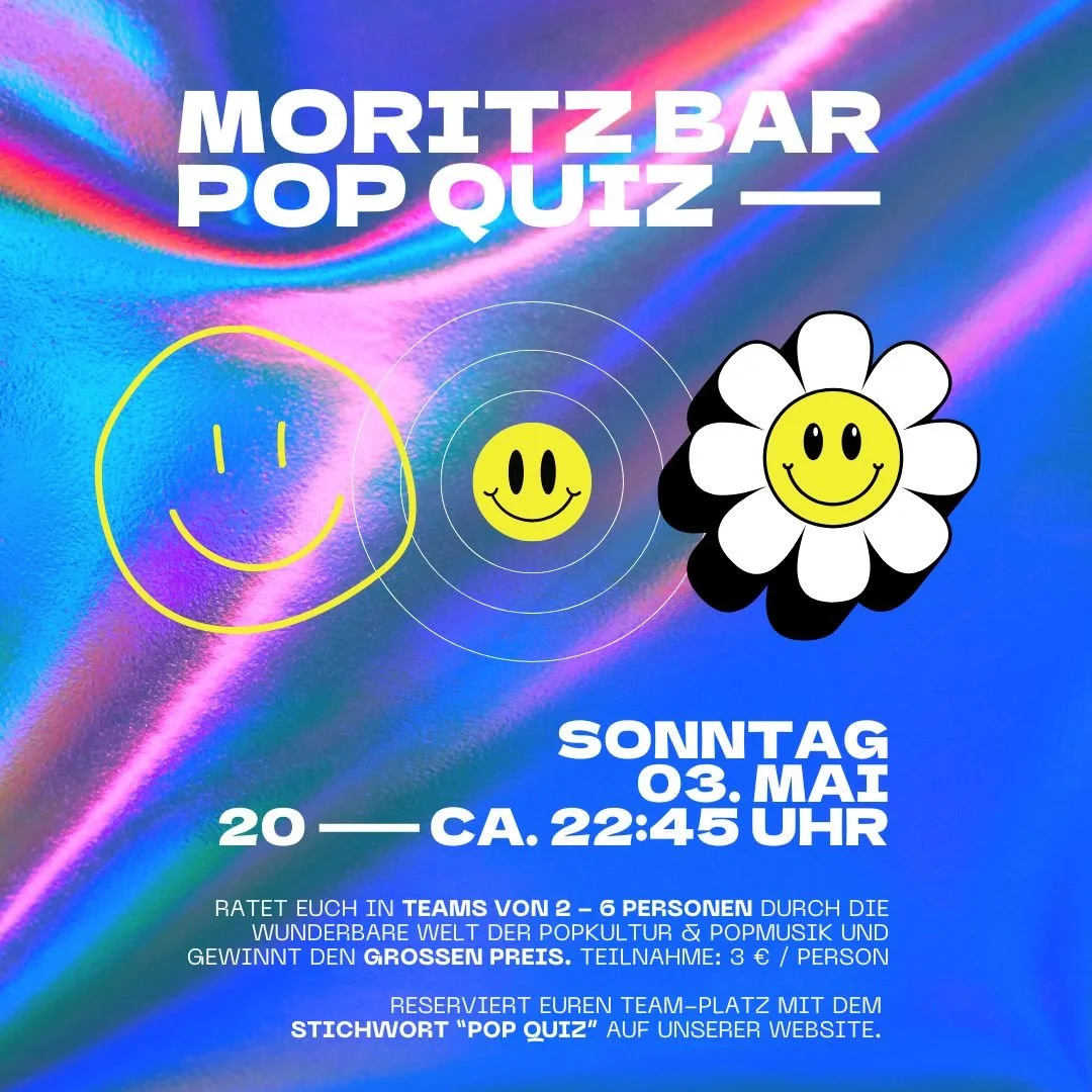 Quiz-Beginn um 20:00 UhrOMG, unser epic Moritz Bar POP QUIZ ist zurück für eine neue Runde. Rate dich mit deinem Team von 2 - 6 Personen durch die wunderbare Welt der Popkultur und Popmusik und gewinnt den großen Preis. Wir quizzen uns durch verschiedene Kategorien wie: Gossip, Lifestyle und natürlich ganz viel Popmusik. Endlich kannst du all dein unnötiges Wissen über Celebrities und Popkultur mal gewinnbringend einsetzen! Und zwischendurch gibt’s natürlich genug Pausen zum Entspannen.