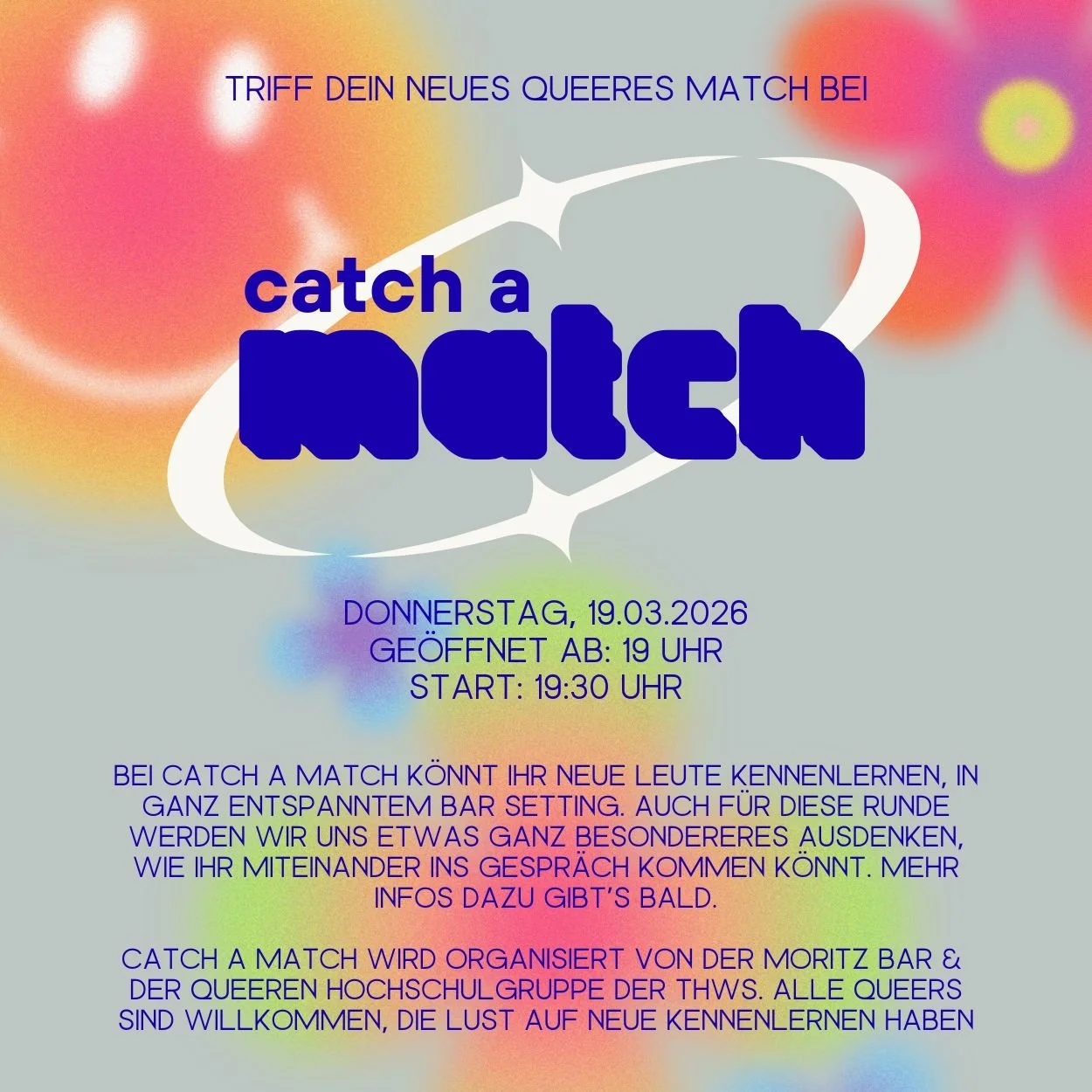 Beginn um 19:30 UhrDie Moritz Bar und die queere Hochschulgruppe der THWS präsentieren euch eine neue Ausgabe von CATCH A MATCH. Das ist euer queeren Kennenlernformat, bei dem ihr neue Leute für Freundschaft, Dating oder was auch immer treffen könnt. Zum Beginn des Abends sucht ihr euch ein Armbändchen aus das am ehesten repräsentiert, wonach ihr Ausschau haltet. Durch den Abend führen unsere zwei Match Angels, die um 19:30 Uhr auch noch einmal erklären wie der Abend abläuft. Auch dieses Mal denken wir uns wieder etwas ganz Besonderes für euch aus, mehr Infos gibt es bald hier.