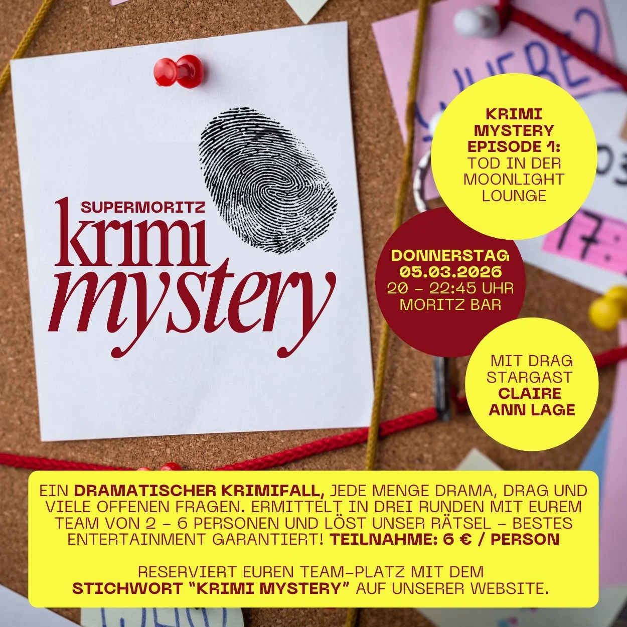 Krimi Mystery-Beginn um 20:00 UhrIhr liebt unser Quiz - und deswegen haben wir uns noch etwas Neues für euch ausgedacht. Statt durch die Welt der Popkultur laden wir euch ein, euch durch einen dramatischen Krimifall zu raten: Beim Supermoritz KRIMI MYSTERY. Ihr könnt in Teams von 2 - 6 Personen teilnehmen und euch in der Moritz Bar einen richtig unterhaltsamen Abend machen. Denn wir servieren euch einen epischen Krimifall: Mit Schauspiel-Einlagen, Hinweisen und vielen offenen Fragen. In drei Runden ratet ihr euch mit eurem Team durch das Krimi-Rätsel und am Ende erfahrt ihr, ob ihr alle Hinweise richtig kombiniert habt. Stellt euch das Ganze vor als eine Mischung aus Spieleabend, Escape-Room und Krimidinner. Für den spannenden Fall sorgen für euch Drag Stargast Claire Ann Lage und Kilian von der Moritz Bar. Und eines können wir euch versprechen: Es wird witzig, es wird spannend, es wird camp, und es wird beste Unterhaltung sein.