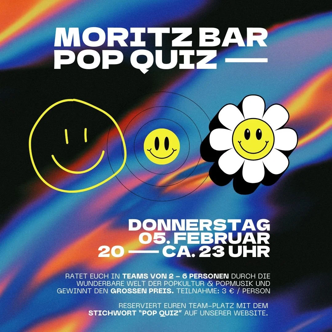OMG, unser epic Moritz Bar POP QUIZ ist zurück. Rate dich mit deinem Team von 2 - 6 Personen durch die wunderbare Welt der Popkultur und Popmusik und gewinnt den großen Preis. Wir quizzen uns durch verschiedene Kategorien wie: Gossip, Lifestyle und natürlich ganz viel Popmusik. Endlich kannst du all dein unnötiges Wissen über Celebrities und Popkultur mal gewinnbringend einsetzen! Und zwischendurch gibt’s natürlich genug Pausen zum Entspannen.