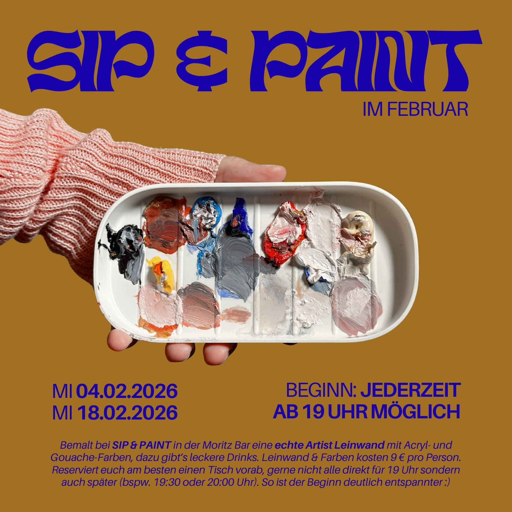 In der Moritz Bar wird es wieder kreativ. Bei SIP & PAINT bekommt ihr von uns das gesamte nötige Material, um eine eigenes Bild zu bemalen - und danach könnt ihr es natürlich mit nach Hause nehmen. Dazu könnt ihr ganz gemütlich den ein oder anderen Drink schlürfen. Macht euch mal wieder einen richtig schönen und kreativen Abend, alleine oder mit euren Besties. Das Material (professionelle Artist-Leinwand, Pinsel, Acryl- und Gouachefarben) gibt es gegen einen Unkostenbeitrag von 9.00 € bei uns.
